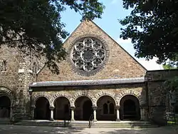 The area that is now the town of Brookline was known as Muddy River in the 17th century, after a crossing point of the eponymous river. The town was incorporated in 1705, and the site for its first meeting house and cemetery were chosen near what was at the time its geographic center. Brookline is unusual in Massachusetts in that its first town hall still survives: it is a stone structure built in 1825, now serving as the parish hall of the First Parish Church on Walnut Street.[2] The town's Old Burying Ground, located at Walnut and Chestnut Streets, was also laid out at that time. When the Worcester Turnpike (now Massachusetts Route 9) opened in the early 19th century, the town's civic focus moved to Brookline Village. Later in the 19th century, the surrounding farmland was subdivided and fashionable residences were built.[3][4]