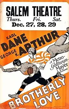 Brotherly Love is a 1928 sound part-talkie comedy film produced and distributed by MGM and directed by Charles Reisner. It is a starring vehicle for the comedy team of Karl Dane and George K. Arthur. Young Jean Arthur supports the comedy duo. In addition to sequences with audible dialogue or talking sequences, the film features a synchronized musical score and sound effects along with English intertitles. The soundtrack was recorded using the Western Electric sound-on-film system.[1][2]
