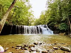 The creek's most notable feature is Brush Creek Falls. With its 25 ft (7.6 m) drop, it is the largest waterfall in Southern West Virginia.[2] It is found in the Brush Creek Nature Preserve, a 124-acre (50 ha) area by the confluence of Brush Creek and the Bluestone River.[3][2] The falls lies along County Route 3 and the Bluestone River to the north of the town of Athens of Mercer County.[4] Its elevation is 1,952 ft (595 m).[5] At the site of the falls, the creek's width is 50 feet (15 m) or more, depending on water levels.[3]