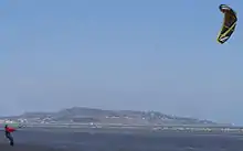 A kite enthusiast on Bull Island with Howth and the Sutton Martello tower in the background.