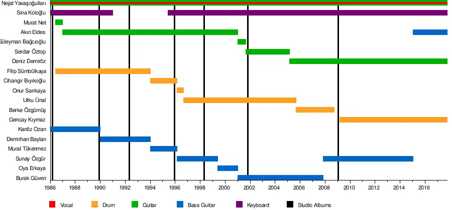 Former members include Ozan Kanöz, Akın Eldes, Filip Sümbülkaya, Richard Hames, Demirhan Baylan, Murat Tükenmez, Cihangir Bıyıkoğlu, Utku Ünal, Burak Güven, Süleyman Bağcıoğlu and Serdar Öztop.