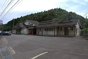 The station consists of two side platforms serving two tracks. The station building is an old wooden structure where the floorspace is shared with a post office and the local tourism information centre. Access to the opposite side platform is by means of a level crossing. The station is not staffed by JR Kyushu but some types of tickets are available from a kan'i itaku agent who staffs the ticket window.[2][3][4]