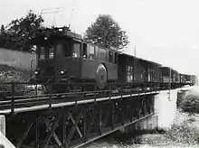 The positive experience with three-phase operations on the Luzern–Stans–Engelberg railway (Stansstad-Engelberg-Bahn) and especially the influence of the electrical engineer Emil Blattner, who was both professor of electrical engineering at the Burgdorf College of Technology (now part of the Bern University of Applied Sciences) and a councillor of Burgdorf, led to a bold decision by the Burgdorf-Thun Railway to electrify the line at 750 volts and 40 hertz three-phase from the start of operations on its relatively long line.[2] Permission to use a high voltage was granted by the Railway Department without regard to the safety of passengers and staff. The electric operations enabled a tight timetable for the time, which was useful in view of the many connections in Burgdorf, Konolfingen and Thun. A contract was signed with Brown, Boveri & Cie. for the supply of electrical equipment and Motor AG was awarded the contract to supply power through the new Kander power station near Spiez.