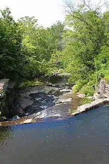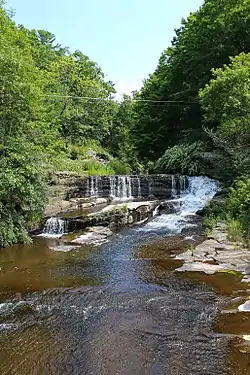 In the distant past, accumulating piles of glacial drift caused Buttermilk Creek to alter its course and flow over a series of cliffs as a waterfall.[7] The total height of the cliffs is 155 feet (47 m) and they consist of sandstone of the Catskill Formation.[7][8] The falls, which are known as Buttermilk Falls, are a series of low waterfalls that are an "excellent example of the type" and "the most outstanding example of this kind of waterfall system in Pennsylvania".[8] Each individual waterfall ranges in height from 10 to 35 feet (3.0 to 10.7 m). The falls are located 0.3 miles (0.48 km) upstream of the creek's mouth.[8] Buttermilk Creek flows through a narrow defile in its lower reaches. In some reaches, the creek flows through bottom lands and swamps in glacial drift.[5]