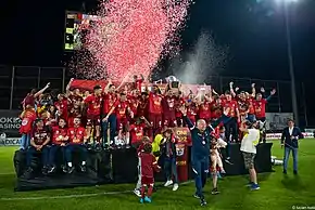 CFR Cluj began the 2014–15 season well, but financial difficulties led to insolvency which subsequently started a period of poor performances.[13] After failing to fully remunerate five former club players, the Romanian Football Federation decided to deduct 24 points from CFR, which placed them in the last position in Liga I. Many players left the club as a result, and Ceferiștii challenged the Federation's decision to the Court of Arbitration for Sport. In May 2015 the Court ruled in their favour, restoring the deducted points, which helped the team secure a third-place finish in the league championship. CFR Cluj won the 2016 Cupa României final played against Dinamo București after penalty shootouts,[14] being their first trophy since 2012.