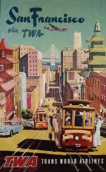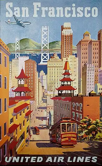 Vintage airline posters of San Francisco, featuring cable cars, looking east from approximately the intersection of California and Stockton towards San Francisco Bay and the western span of the Bay Bridge. A 2016 photograph with a similar perspective is included to illustrate the prominence of skyscrapers in the present-day Financial District.