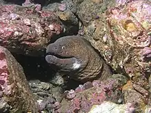 The California moray (Gymnothorax mordax) is a moray eel of the family Muraenidae, found in the eastern Pacific from just north of Santa Barbara to Santa Maria Bay in Baja California.[2] They are the only species of moray eel found off California, and one of the few examples of a subtropical moray. They typically occupy boulder or cobble habitats up to 40 m in depth.[3] They can attain lengths of about 5 ft (1.52 m) and are believed to live for upwards of 22–26 years.[4] Like other morays, they have no pelvic or pectoral fins or gill covers.