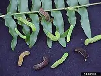 The larvae feed on various ferns, including Nephrolepis exaltata and Pteris vittata. They are highly variable in coloration, ranging from green to brown, black or reddish. It is an occasional pest in greenhouses. The larvae were recently discovered to have high levels of arsenic when feeding on P. vittata,[4] and are the only known terrestrial animal to accumulate arsenic.[5]
