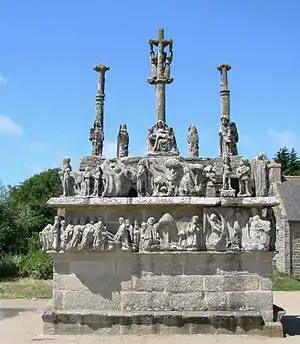 Calvary at Tronoën is a calvary located at Saint-Jean-Trolimon in the Quimper arrondissement. It is located in the "pays bigouden", a particularly wind swept area of Brittany; the nearby chapelle was called the "cathédrale des dunes".