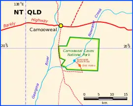 - ↑ "Camooweal Caves National Park topographic map, elevation, relief". topographic-map.com. Retrieved 14 February 2022.
