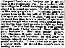 It had better fortune in the Stirlingshire. The club seemed to have beaten Dunipace by a healthy 4–0, but, as darkness had ended the tie with 15 minutes to go, the Stirlingshire FA ordered the tie to be replayed.[8] Dunipace made 8 changes, supposedly to make its side stronger, but the Hibs ran riot, scoring 18 goals, and another 5 being disputed.[9] The Hibs were given a bye into the quarter-final, but lost 6–1 against Laurieston, the match being plagued by "a gang of young ruffians who attend football matches for the purpose of causing disturbances".[10]