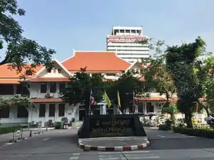 The college's administration had laid out a plan for its physical development in 1913, with the eastern side dedicated to academic and administration buildings, and the western side used for agricultural research.[1] The first permanent structure, the Administration Building, was constructed from 1915 to 1921, and became the university's main building. It was followed by the Science Building in 1929 and Chakrabongse Building (hosting the student clubs) in 1933. These early structures, along with the Auditorium (1939), incorporated Thai-style elements with modern construction methods, in contrast to the increasing adoption of modernist architecture following the abolition of absolute monarchy in 1932, influences of which are seen in the Engineering and Physics buildings (1935), Matthayom Horwang School (1936), Chemistry Building (1940), and the Architecture, Dentistry and Pharmaceutical buildings (1941). The majority of these early buildings saw design contributions by Phra Sarotrattananimman, one of the first formally trained Thai architects.[2]