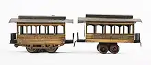 In 1897, they made a train set with a 4-wheel coal mining locomotive, three coal cars, two zinc-carbon elements, and a can of chromite. The locomotive included a switch for starting and reversing, and was powerful enough to pull the three loaded cars up a grade. That same year, they also made an "electric railway with double truck car" set, with a car running on two 4-wheel trucks. It was 12 inches (30 cm) long, 5 inches (13 cm) high, and 3.5 inches (8.9 cm) wide, and made of polished brass with iron wheels. It had two motors and could run at 150 feet per minute (46 m/min). Both sets included 18 feet (5.5 m) of 2-inch (51 mm) gauge track.[12]