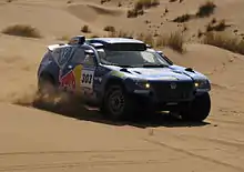 2006 saw a first participation for Sainz at the wheel of a Volkswagen in that year's Dakar Rally, sharing the cockpit with the two times winner of the Dakar Rally, Andreas Schulz. In 2007, he repeated his attempt with Volkswagen, this time with French Michel Perin, also a former winner of the raid. Following the resignation of Fernando Martin, he even ran, eventually in vain, for the vice-president position at his beloved football club Real Madrid, for which he once trained. In 2007 Sainz won the FIA Cross-Country Rally World Cup with the Volkswagen team. In 2008, he won the Central Europe Rally, which was the relocated and rescheduled Dakar Rally for that year because of a terrorist attack.[15] In January 2009, partnering again with Perin, he led the Dakar Rally until crashing out on the 12th stage.[16] Later in 2009 Sainz won Silk Way Rally with Volkswagen team.[17] At the 2010 Dakar Rally, Sainz changed again co-pilot, teaming with fellow Spaniard Lucas Cruz. Sainz edged out teammate Nasser Al-Attiyah to take his maiden win in the event.[18] In 2010 Sainz also won the Silk Way Rally for the second time.[19] In the 2011 Dakar Rally Sainz finished third.