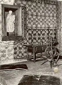 From this documentation, thoroughly studied by es:Luis Astrana Marín, we know that instead of occupying the three houses joined to create the museum, his mother lived in one room and the rest of his household in another, above a tavern on the ground floor.[1]: Vol. 6, Chapter LXXIII Only women were living with him: his wife Catalina, his very religious ("beata") sister Magdalena, a seamstress for wealthy gentlemen,[2] his sister Andrea, also a seamstress, her illegitimate daughter Costanza, Cervantes' illegitimate daughter Isabel, and a maid named María. It is well documented in the testimony that prostitutes were associated with the house, but the identity of the prostitutes has never been clarified. There were suspicions that among them may have been some of the women in Cervantes' household, who were the only single adult wonen living in the building.