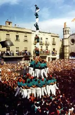 The Castellers de Vilafranca (Catalan pronunciation: [kəstəˈʎez ðə βiləˈfɾaŋkə]) is a cultural and sporting association whose main objective is to build castells (human towers). It has the status of a public-interest association. The group was founded in 1948[1] in response to the increased interest in human tower building in Vilafranca del Penedès, a Catalan tradition that has evolved since the 18th century Ball de Valencians, a dance from Valencia.[2][3]
