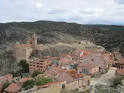 Known as "the small Albarracín", Castielfabib is located on a hill near the right bank of the river Ebrón. Located in the northwest corner of Rincon de Ademuz, it is mountainous with elevation ranging between 800 and 1,550 metres (2,600 and 5,100 ft). The most important points of elevation are: Mill Creek (1,338 m), Peña de Águila (1,112 m), Peral (1481 m), Cabezo (1,442 m), Macarron (1,222 m), Umbria La Muela (1,068 m) and Cross of the Three Kingdoms (1,552 m), so named because its summit joined the old kingdoms of Aragon, Castile and Valencia. The river Turia flows from the north, serving as the border with Teruel.[2] It flows on the east of Riodeva, bordering Torre Baja. Ebrón River crosses the territory from northwest to southeast, flowing into Turia, the boulevard of Palomarejos runs north and comes to the precipice of the Canaleja. The climate is continental, with prevailing winds from the north and east, the latter bringing rains in April.