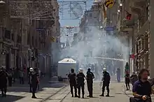 The Turkish Medical Association reported on 4 June that 4177 people were reported as wounded in Turkey, 43 of these being heavily wounded and 3 in a critical condition. These people, including "a large number of citizens who lost their eyes", were injured as a result of water cannons and close-range shots from tear gas canisters and plastic bullets aimed directly at them.[5] Amnesty International said water cannons had been targeted at peaceful protesters, while "the inappropriate use of tear gas by police has been the most devastating on the safety of demonstrators, causing an unknown number of injuries, including serious head injuries when the canisters hit protestors."[6] Police were reported to have disguised their ID numbers.[7][8] Human Rights Watch also condemned this misuse of tear gas.[9]