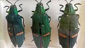 Catoxantha opulenta can reach a length of about 45 and 60 millimetres (1.8 and 2.4 in). This beautiful and quite common jewel beetle has metallic dark bluish-green elytra with thick and prominent black costae and two yellow transverse bands. Abdominal sternum is yellow. It bores the wood of Chukrasia velutina and Lagerstroemia speciosa. The life-cycle is annual. Adults emerge in June.