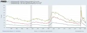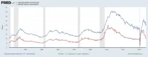There are many domestic factors affecting the U.S. labor force and employment levels. These include: economic growth; cyclical and structural factors; demographics; education and training; innovation; labor unions; and industry consolidation[2] In addition to macroeconomic and individual firm-related factors, there are individual-related factors that influence the risk of unemployment. These factors include gender, race/ethnicity, family background, industry, level of education, and level of job tenure.[3] There is an employment gap between Whites and African Americans, although smaller for high-skilled workers than low-skill workers which suggests the presence of racial discrimination.[4] Education is found to be positively correlated with employment, which implies that groups with higher levels of education generally have lower unemployment rates.[5] The effects of incarceration and emotional functioning have also been explored.[6] At the community level, for example, jail incarceration has been found to negatively affect local labor markets, especially in areas with relatively high proportions of Black residents.[7]