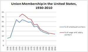 However, labor union participation rates have declined steadily in the United States. According to the Bureau of Labor Statistics annual Union Members Summary: "In 2012, the union membership rate—the percent of wage and salary workers who were members of a union—was 11.3 percent, down from 11.8 percent in 2011. The number of wage and salary workers belonging to unions, at 14.4 million, also declined over the year. In 1983, the first year for which comparable union data are available, the union membership rate was 20.1 percent, and there were 17.7 million union workers."[53] In 1973, the participation rate was 26.7% against a comparable 2011 rate of 13.1%.[54]