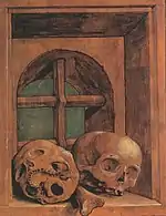 While his neighbours did not accept his ideas, he continued to live, educating his sons, and living in harmony with the residents of the village. After a few years, Demétrio, now an old man, after many years in bed with illness, died. At that moment a wagtail flew onto a faia tree close by, but did not begin to sing as was expected. Demétrio was buried on top of a mountain, and his wife, influenced by her husband's faith, was a little preoccupied with the fact that the bird did not sing. After some time afterword there started to appear a skull (Portuguese: caveira) with an inner light, and the local residents believed that it was Demétrio's soul trying to obtain prayers in order to be delivered from Purgatory. Someone then decided to begin services and pray the rosary for God's intercession on behalf of the good, but heretical, Demétrio. After a short time, the bird began to sing and the skull stopped appearing. At the top of the rugged rock the family constructed a niche, with a panel representing the skull, but the name of the village began to referred to as Caveira.[3]