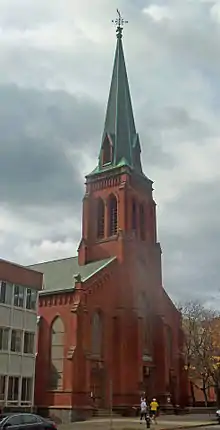 • Trinity United Methodist Church, Lark and Lancaster streets. A 1932 fire destroyed the church that replaced one on this site after a 1901 fire. The church responded later that year by building one of the largest religious building complexes in the city. Philadelphia architects Sunndt and Wenner designed this large limestone building with Neo-Gothic and Art Deco aspects. Elsewhere on the property is a chapel and parish house, the latter incorporating parts of a 1926 building that survived the 1932 fire.[9]:138
