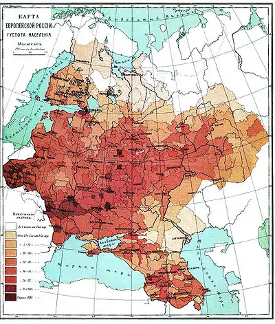 An arc of provinces at the southern edge of the Central Agricultural Zone was where the agrarian violence – the peasants' war against the squires – of the revolution was concentrated, presenting a distinctive distribution: from Samara and Saratov, through Tambov, Voronezh, Kursk, Kharkov, Chernigov, Ekaterinoslav, Kherson and Poltava, all the way to Kiev and Podolia in the southwest.[11] This 'transitional region' of overpopulation and large landownership by the gentry, with high land rents and low wages, but with fertile soil and decently long growing seasons favourable to the development of commercial mechanised farming and cultivation of wheat, sugar-beet, etc. were, according to Figes, 'caught in the worst of all possible worlds: between the old pre-capitalist system of agriculture in the centre, and the emergent system of commercial farming at the periphery'. Though at extortionate prices, the leasing of land from the gentry managed most peasants to just about survive during the economic agricultural price depression between 1876 and 1896. As the price of cereals rose and the price of transportation fell, however, many landowners turned their estates into commercial farms, greatly increasing the share of landownership by the gentry between 1900 and 1914 (an increase of one third, but even higher in the 'transitional regions', like in Poltava Province where their share doubled).[11] This resulted in rented out land being withdrawn, or rented out at even higher prices, and the lease system being altered from a money rent to labour rent (otrabotka), perceived by the peasants as a new form of serfdom. With a modernisation of their farms, the need for peasant labour also decreased, reducing wages in the process. Within the final decades of the Russian Empire, millions of peasants had been driven off the land due to poverty, or a misfortune like the death of a family member, which was very difficult to handle economically for a severely indebted household.[11]