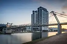 In 2020, a large real estate was unveiled on the western tip of the park, "River Tower".[6] Located along the river, in the vicinity of Łuczniczka and Torbyd halls, it consists of a pair of 64 metres (210 ft)-high and 20-floors towers. The twin buildings, encompassing 128 apartments, are the tallest residential edifice in Bydgoszcz and houses also a restaurant, a gym, a playing ground for children and a mini-marina.[7]