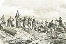 Upon access Sanz declined an offer to be promoted to a comandante; he was assigned to the troops commanded by general Nicolas Ollo and operating in central Navarre. It is not clear what unit he was heading during the 1873 campaign, first taking part in victorious battles of Allo and Dicastillo, then taking Estella and finally laying siege to Viana and Lumbier.[29] Gaining his comandante stripes on the battlefield, later in the year he was entrusted with organization of 9. Batallón de Navarra, the unit he then led in combat.[30] In June 1874 he organized a daring attempt to capture Lumbier, an episode which almost cost him life when cut off from his troops, in an isolated house and with personal staff only he fought off enemy soldiers.[31] In the second half of 1874 Sanz led the 9. Battalion at Rocafuerte, Abárzuza and Sangüesa,[32] recognized for both serenity and valor when under fire. During fighting at Santa Margarita heights he personally led a company in a head-on charge and had his horse shot; he was afterwards promoted to teniente coronel.[33]