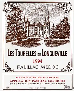 Château Pichon Longueville Baron or Château Longueville au Baron de Pichon-Longueville (commonly referred to as Pichon Baron) is a winery in the Pauillac appellation of the Bordeaux region of France. Château Pichon Longueville Baron is also the name of the red wine produced by this property. The wine produced here was classified as one of fifteen Deuxièmes Crus (Second Growths) in the original Bordeaux Wine Official Classification of 1855.