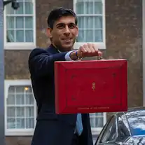 Sunak holding up a red box containing the 2021 autumn budget speech
