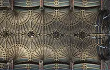 The whole was carefully taken down as far as the surbase and thoroughly overhauled. As much of the old work as it was possible to save was used again, some of the pilasters being rubbed down and repolished. Panels, frames, the columns next the centre, and all defective parts, were replaced with new. The panelling and seats, now stripped of their varnish, are the original work, except that a third row was added in 1884, though an addition to the screen was made when the organ was erected. The ceiling was recoloured in 1895 by Charles Eamer Kempe,[38] a move which has been both extensively praised and criticised; one commenter in the 1970s remarked that "anything as strange and curious as Arts and Craft aestheticism overlaid on seventeenth-century fake Gothic, which in turn disguises a genuine fifteenth-century hammer-beam roof is certainly worth keeping - if only for the sheer zaniness of it all".[14]