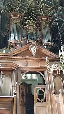 The current organ was originally installed in 1973, although it is still housed in the old late Victorian organ case. It was rebuilt in 20023, with additions and re-fittings.[39] The current chapel is open to members of all denominations.[40] The current chaplain is Reverend Dr Dominic Keech, who also serves in a pastoral capacity.[41] The chapel also houses a portrait and a painting of one hand of the Childe of Hale, described in contemporary sources as man of 9 foot 3 inches in height. This recalls a visit to the college on his return from a visit to London in 1617.[14][42]