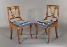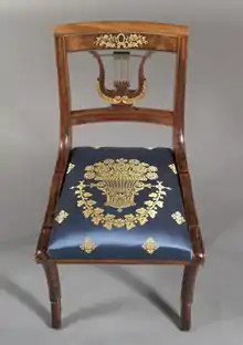 This particular set of twelve (12) Lannuier chairs (referred to as the "James Bosley Set")[1] consisting of 2 Arm chairs and 10 side chairs in the Neoclassical French style was purchased for Bosley's Music room in Baltimore, Maryland. According to Mr. Peter Kenny's Book on Lannuier for the NY Met (pages 133–137) it is believed that James Bosley acquired the set of chairs from Lannuier's client, A.S. Bulloch in Savannah, Georgia.[2][3] Archibald Stobo Bullock and his Wife, Sara Glen built the 'Bulloch-Habersham' house at 229 Barnard Street, Orleans Square in Savannah, Georgia, and filled the new house with a large quantity of furniture that had been shipped to Bulloch from Charles-Honore'Lannuier shortly before his death. Due to the Great Savannah Fire in 1820, Bulloch was forced to sell his possessions and eventually his house. James Bosley purchased the set which he used to furnish the music room in his new townhouse on Calvert Street in Baltimore.