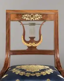 Lannuier's furniture is characterized by its use of architectural motifs–-columns, brackets, pediments, and pilasters; Greek and Roman motifs including anthemions, lyres, caryatids, dolphins, laurel wreaths, and winged figures. Federal motifs associated with the early Republic include eagles and five- or six-pointed stars. Large figures were carved and gilded, while smaller decorative mounts were cast in bronze and gilded.