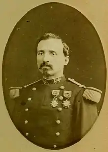 Bégin was promoted to Captain on 13 May 1863, and arrived in Saigon, Cochinchina in January 1864. He participated in a small expeditionary force that put down a rebellion in the province of Tây Ninh, and was cited in September 1866. In March 1867 he was awarded the Cross of the Legion of Honour. In 1868 he returned to France and rejoined the fusiliers training battalion.[2] On 1 January 1869 he was Adjutant-major of the 2nd Marine Infantry Regiment in Brest. He was appointed Major, or Chef de bataillon, on 16 March 1870.[3] He returned to Cochinchina, where he was appointed senior commander in the western provinces. In 1872 he suppressed a rebellion in the cercles of Mỏ Cày, Trà Vinh and Vĩnh Long. He was again cited, and on 25 July 1872 was promoted to Officer of the Legion of Honour.[2]