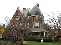 The Charles B. Russell House (also known as the "Duffel Building") is a historic residence in the Clifton neighborhood of Cincinnati, Ohio, United States. Built in 1890,[1] it is a large two-and-a-half-story house constructed primarily of limestone. Multiple windows, including several dormer windows, pierce all sides of the turret, while another large dormer window with Palladian influences is present on the house's southern side. A common theme in the design of the house's windows are string courses of stone that connect the windows and voussoirs that radiate out from the windows to many directions. Among its most distinctive architectural elements are the heavy stone front porch, which transitions from a verandah on one end to a sun porch on the other end, and the large circular turret on the front corner of the house, which is capped with a beehive-shaped pinnacle.[2]