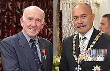 Higham (left) in 2016, at his investiture as an Officer of the New Zealand Order of Merit, by the governor-general, Sir Jerry Mateparae