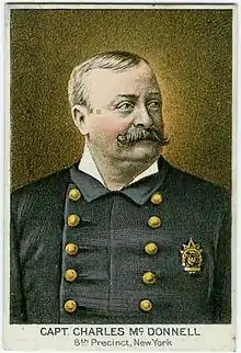 On December 2, 1864, McDonnell won promotion to roundsman for his brave conduct in arresting a negro burglar. He slowly rose through the ranks after being promoted to sergeant on November 11, 1867 and finally captain on February 25, 1870. His first command was the old Twenty-Eighth precinct and, during the next four years, served as precinct captain of the Twentieth, Twenty-First and Thirty-First Precincts. On November 11, 1874, McDonnell was transferred to the Eighth Precinct where he remained for the rest of his career. In 1875, during the "grabber scandal", he captured notorious kidnapper-procuress Jane the Grabber.[3][4] On the day of the last-ever police parade, he arrested negro gambler Samuel S. Brewster for the murder of rival gambler Eibo Williams on July 16, 1887.[1]