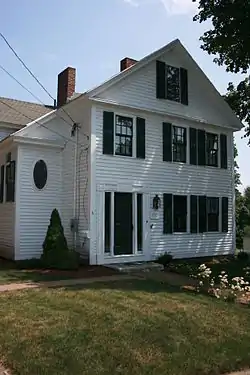 Likely built in 1840s, the 2+12-story wood-frame house is a rare local example of a house transitional between Federal and Greek Revival styling. The side hall, front gable plan is typically Greek Revival, but some details are Federal, such as the narrow corner boards. The doorway, flanked by sidelight windows and surrounded by an architrave with corner and center blocks, was derived from designs published by Asher Benjamin.[3] The house's northern wing and main stair, featuring Colonial Revival details, was likely an addition added by Fuller.