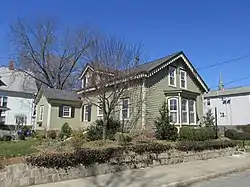 The Charles Payne House is a 1+12-story Gothic-Italianate vernacular cottage that has a spacious garden founded on the site of a long-removed house. The house's gable end faces the street with a rear ell and the other ell perpendicular to the main block on the west side. Centered on the east end of the roof is a cross gable which is visually offset by the dormer on the west. The house has a small gable-roofed vestibule on the east side, aligned underneath the cross-gable. The rear ell has an attached porch that spans its length. A single story bay hexagonal bay window protrudes from the facade. The distinguishing feature of the Payne house is the wood trim exterior, consisting of hood mould on the paired windows on the south, four kinds of bargeboards and bracketed cornices on the rear ell's east side. The interior of the Charles Payne House is not covered in detail by any survey, but has three mantelpieces on the first floor, two displaying Gothic Revival influence in their wooden designs and the third, located in the rear ell, made of grey marble with a round-head opening.[2] Though not mentioned in the nomination, a photo shows one of the wooden mantlepieces filled with brick and rendered unusable at the time.[3] The setting of the house was important to the National Register nomination, which specifically highlighted its shaded garden and fencing. At the time of the nomination, an ornamental round head picket fence surrounded the property and access was through a double-leaf lattice work gate.[2] By 2013, the picket fence and entrance gate had been removed, but the property still retains the street frontage for its garden.[4]