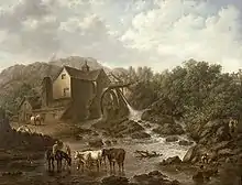 Towne painted landscapes and animals, and obtained great celebrity in Lancashire and Cheshire by his portraits of horses, dogs, and cattle. Many of his pictures were small, but occasionally he ventured into landscapes with cattle of larger size. He also painted in watercolour, and was a candidate for admission to the Watercolour Society in 1809. His work was reasonably well regarded by his contemporary Joseph Farrington, though he also noted that Towne was a man of "coarse, debased manners and conversation".[1] According to artist W. S. Sparrow, "his landscapes are minutely detailed and have a Dutch mannerism; animals and figures are put in with diligent and affectionate care".[2] However the Dictionary of National Biography commented that his work "though carefully drawn" was "wanting in spirit and originality".