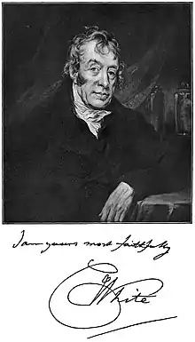 In 1757, White married Ann Bradshaw, whose father had been a high sheriff for the county of Lancaster. They had eight children, four sons and four daughters. Two of his sons had become doctors, but they and his two other sons died before him. In 1803, White suffered an attack of ophthalmia, which initially only affected his left eye, and — with difficulty — he continued to work. In 1811, it affected the right eye and he soon became blind. He died at his home in Sale on 20 February 1813.[1] He was survived by his daughters, one of whom, Anne White, married Sir Richard Clayton, to whom White's thesis on Regular Gradation of man was dedicated.