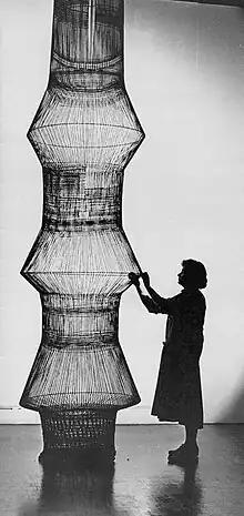 In 1965, her exhibitions included solo shows in New York City, at the Confederation Centre Art Gallery in Charlottetown, PEI, and at the University of Manitoba. In 1966, she exhibited at the Montreal Museum of Fine Arts, in Charlotte Lindgren: Woven Hangings held at the Winnipeg Art Gallery[13] and in Threads of History, an American Federation of Arts exhibition that would tour major American galleries from 1966 to 1969. In 1967, Lindgren's work Winter Tree (1965, Confederation Centre Art Gallery) (148 x 73 cm), a wire hanging composed of a complex single woven form with a tight circular base and a series of loose threads above, suggesting the branches of a tree,[3][14] was featured in Expo 67's Canadian Fine Crafts exhibition. Her sculptural weavings were also displayed alongside other visual arts at the Art Gallery of Ontario's Perspectives 67 where she won a prize for her innovative approach to textiles. Also in 1967 her textile sculpture Aedicule (mohair, wool, synthetic, silk), which invited people to come in and be seated, inspired by a building - a kind of amphitheatre - she had seen in Otaniemi, Finland, designed by architect Alvar Aalto,[2][5] attracted notice at the International Biennial of Tapestry in Lausanne, Switzerland.
