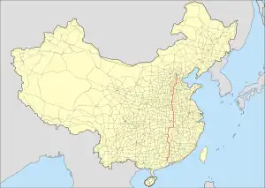 It leaves Beijing at Yuquanying and heads to Gu'an County, Bazhou (Hebei), Kaifeng (Henan), Ezhou (Hubei), and eventually Guangzhou (Guangdong) on the south China coast.