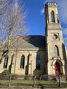 Christ Church's present building was designed in the Gothic Revival style and built of cut sandstone. The church features a crenellated bell tower on its southern corner along with a steeply pitched slate roof, three window bays on each side featuring stained glass tracery windows, stone buttresses and a chancel.[1]