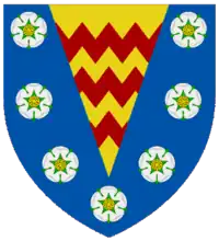 Azure on a pile Or between seven roses Argent barbed and seeded Proper three barrulets dancetty Gules.