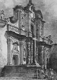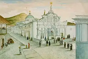 Between 1605[4] and 1614, the Italian priest Nicolás Durán Mastrilli received the plans for the church, which arrived from Rome and were approved by the Company; and begins to execute them with the help of the Basque architect Martín de Azpitarte, under the direction of the work of the also Jesuit Gil de Madrigal (Spaniard).[1] By 1614, part of the work was already open for worship.