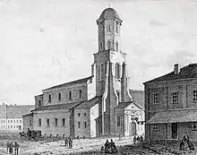 In the 13th century, after the Mongol destruction of the Buda Castle, the church was built in the Castle Hill (Várhegy),[1] which between the second half of the 13th century and today the hill remain similar: the royal accommodation in the south, the Church of the Assumption (Matthias Church), and to the north the Church of Mary Magdalene. The Church of the Blessed Virgin was for the German-speaking that lived in Budapest and the Church of Mary Magdalene was the church of the Hungarian population.[2] At that time, the northern part of the castle hill was called Szombathely Square, which used to host the grand fairs on Saturday, which ran from today's Vienna Gate to Úri Street and included the then vacant lot of the Lutheran church. At the southwestern corner of the square was the Gothic church, originally of a one nave[1] and then in 1400 was expanded. According to contemporary depictions, the tower was covered with a pyramid.